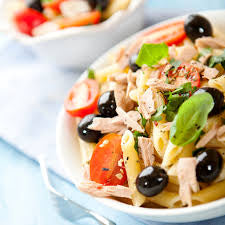 Pasta fredda con pesto, tonno, pomodorini e olive nere
